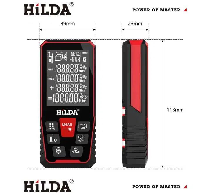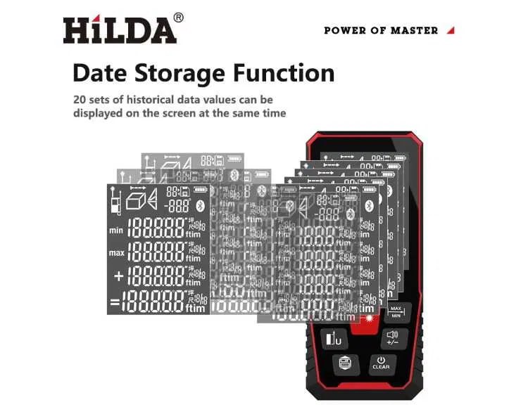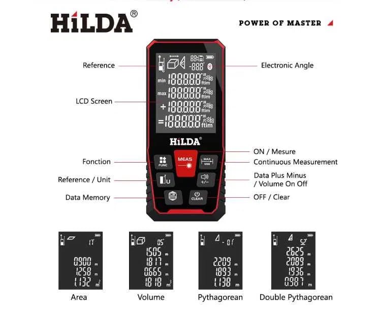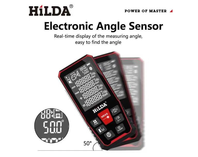 & Free ShippingЛазерная рулетка, лазерный дальномер HILDA, с электронным определением угла, измерение до 100 метров с точностью до 2мм. Оснащен функциями сложения и вычитания, расчета площади и объема, функциями расчета расстояний по теореме Пифагора, измерения недоступных расстояний, определения минимального и максимального значения.